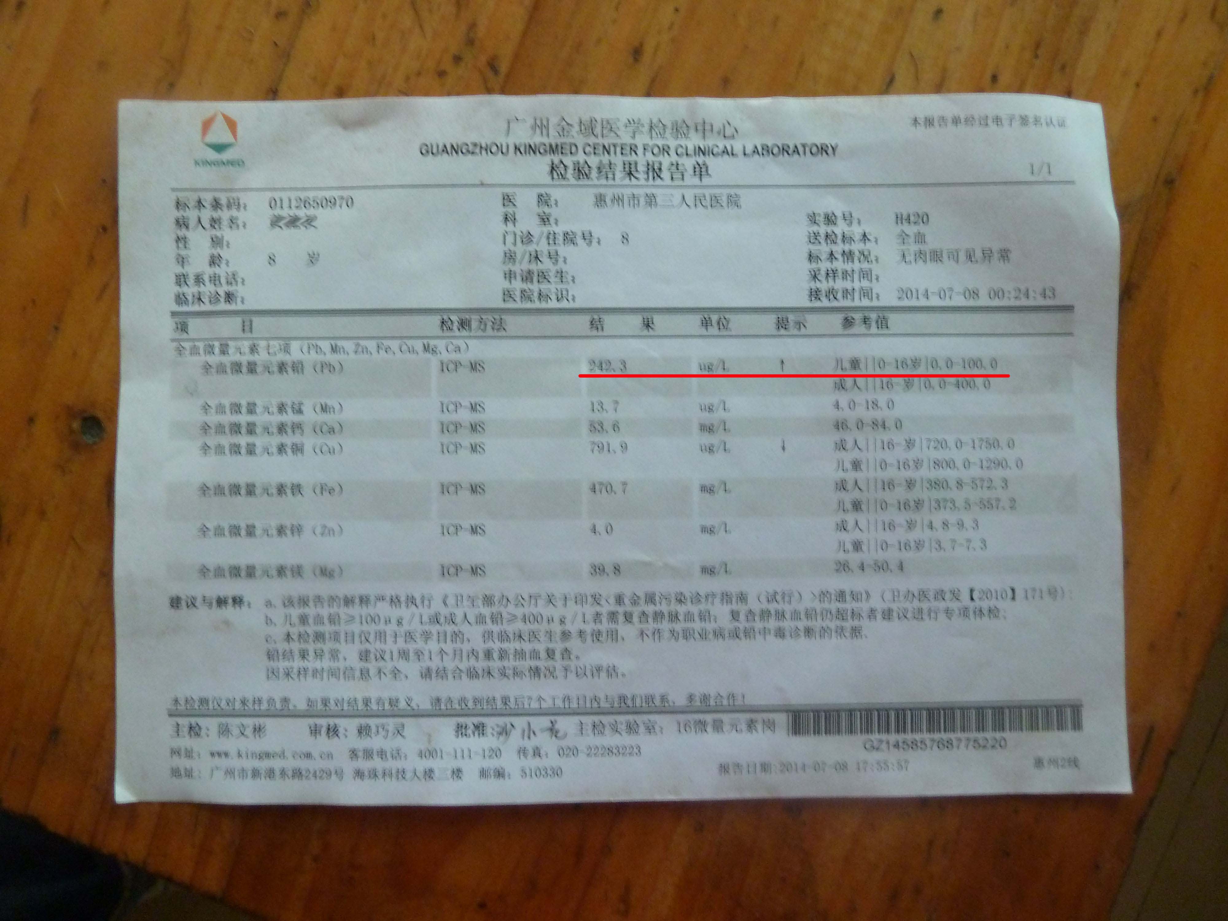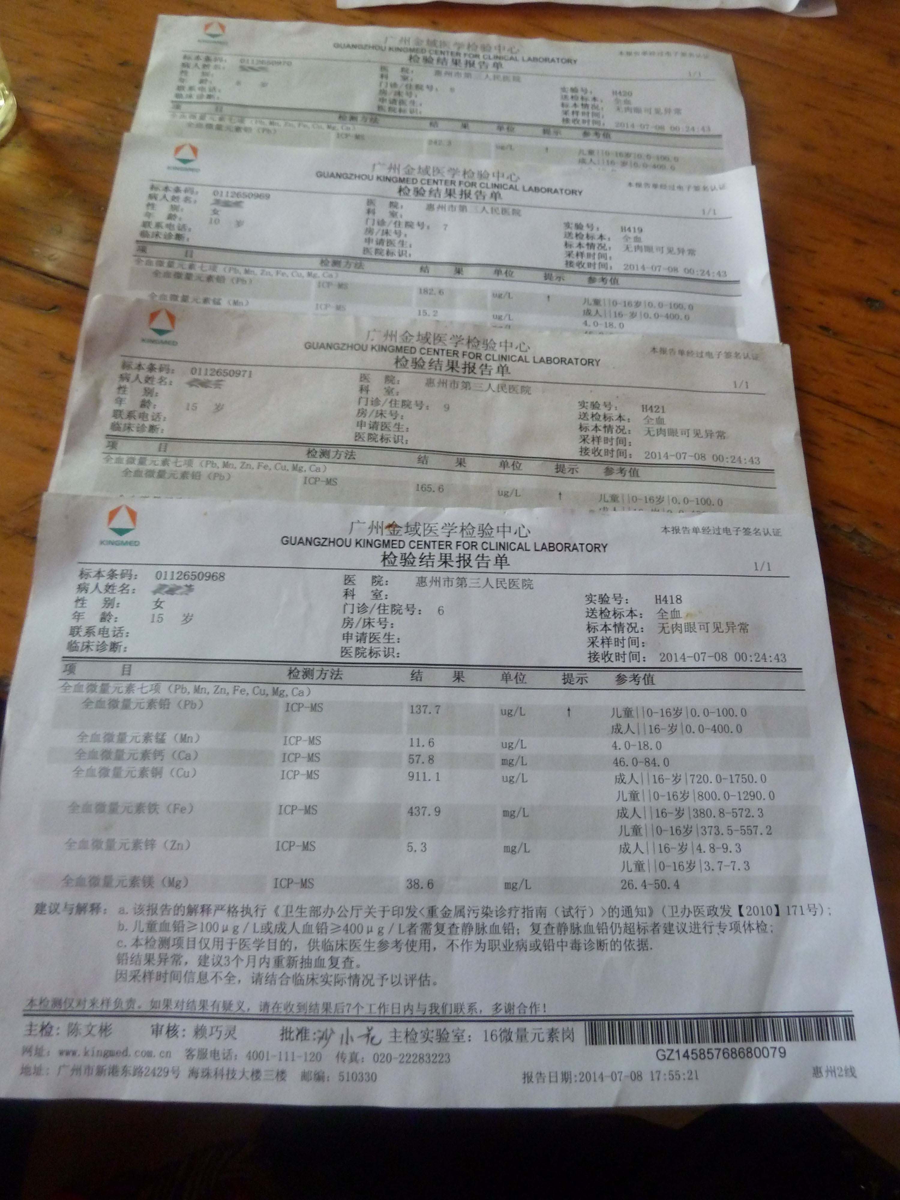 今年5月,村民黄先生带孩子去中心人民医院又做了一次检查,显示血铅指数为230微克/升,虽比之前的400微克/升降了许多,但依旧超过正常值(130微克/升)。