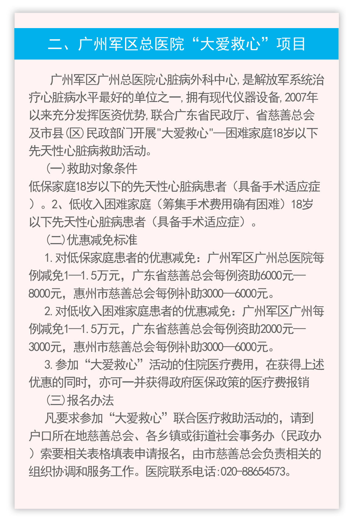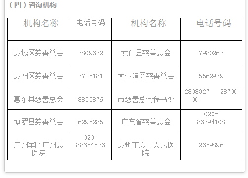 目前,与惠州市慈善总会联系合作的救助困难家庭先天性心脏病患儿的医疗单位有两家。一是广州军区广州总医院心脏病外科中心。二是惠州市第三人民医院。