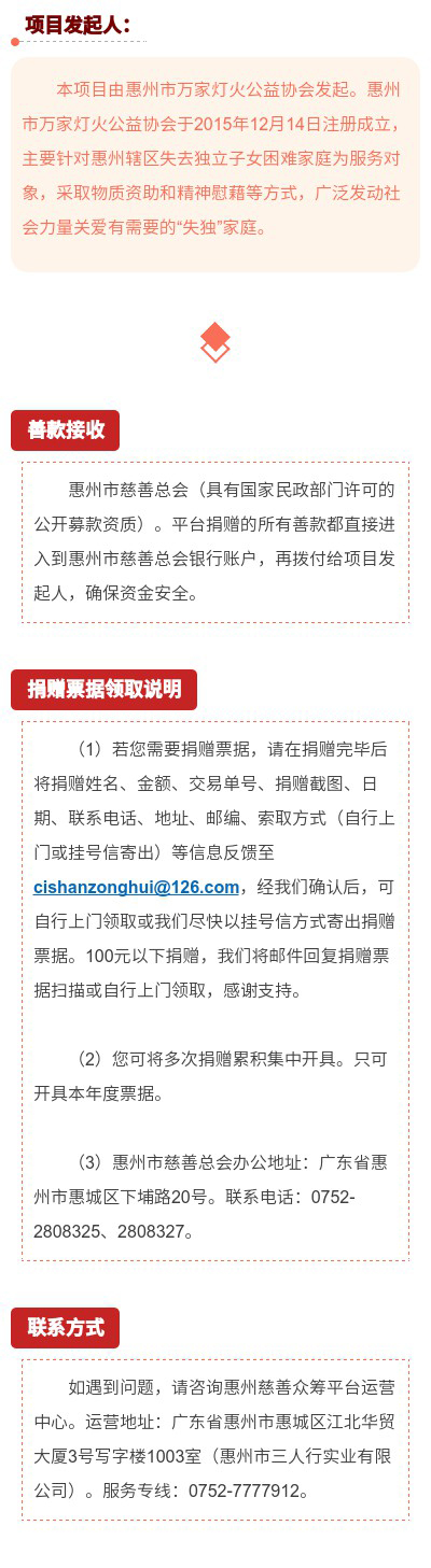 由于惠州市万家灯火公益协会经济条件有限,所以,我们决定在惠州市慈善总会“公益众筹平台”立项,希望得到广大社会各界人士的爱心支持,共同关爱和帮助这些特殊群体。