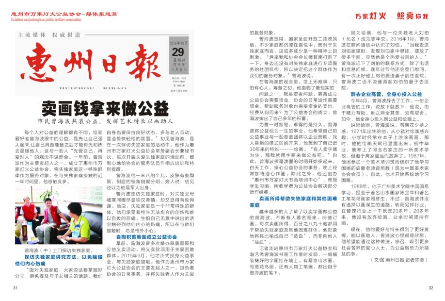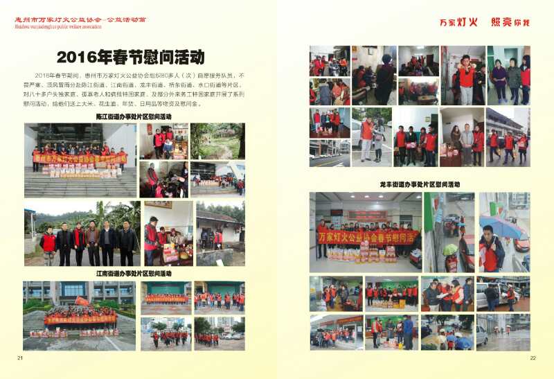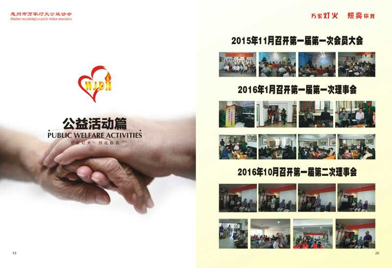 惠州市万家灯火公益协会在民政部门的高度重视下,及社会各界爱心人士的积极参与,2015年12月14日于民政局注册成立。正式通过协会章程和会费标准,组建理事会和组织管理架构。协会的宗旨为主要针对惠州市辖区失去独生子女困难家庭为服务对象,采取物质资助和精神慰藉等方式,广泛感召与发动社会力量关爱有需要的“失独”家庭;同时,以惠州市辖区各类弱势群体为服务对象,采取提供智力和体力劳动、医疗保健、生活技能为主要方式给予关爱和帮扶;以开展公益活动引导邻里互助、敬老爱幼、护绿保洁等,为促进精神文明建设出一分力。