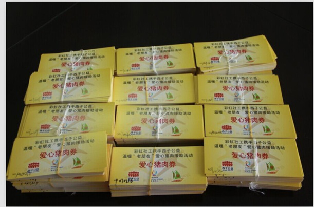 ▲贫困家庭每月有四张爱心猪肉券,每张可领取半斤猪肉,每月领取二斤
