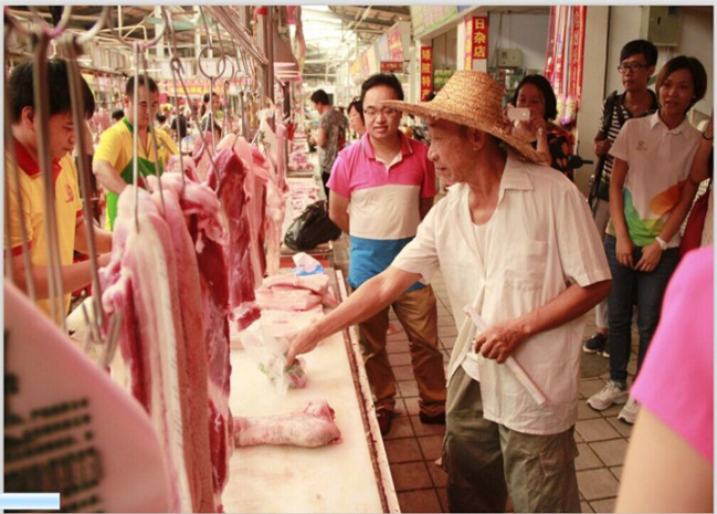 ▲受助家庭凭猪肉券到指定的专卖档口领取新鲜的猪肉