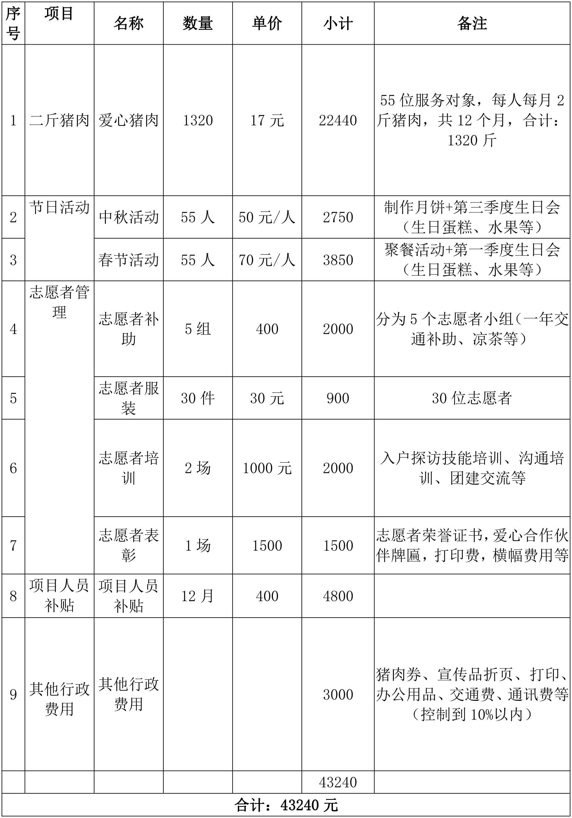 募集款项将用于帮助55位贫困居民改善伙食、提高营养,平均每位贫困居民每月65.5元,一年786元(含节日活动)。