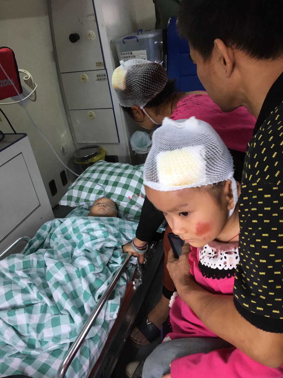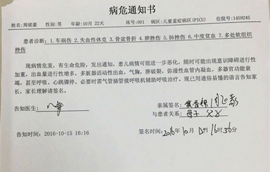 全家人被送到医院,黄香锦和小女儿头部血流不止,直接缝了10针和6针,小宝情况紧急直接被送进抢救室。经诊断,医生下达病危通知书:病情危重,生命危险。失血性休克,脾脏肺脏破裂,多器官功能衰竭,甚至呼吸心跳骤停;骨盆等多处骨折……现在重症室治疗观察。主治医生说:9天才能判断是否脱离危险!但现在病情趋势转差。