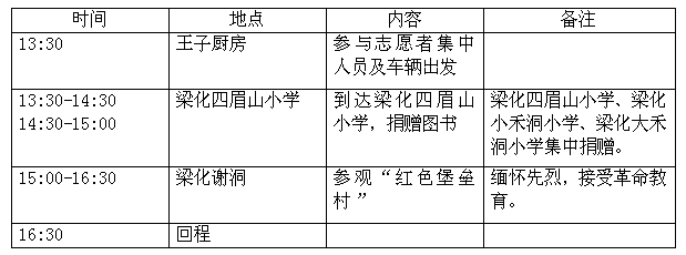 预计经费:众筹平台募捐10000元,惠东县龙华石油实业有限公司董事长赖华先生配捐 10000元,合计20000元,募捐善款将全部用于购书捐赠。其中,梁化四眉山小学预购3000册书籍,费用8000元;梁化小禾洞小学预购2000册书籍,费用6000元;梁化大禾洞小学预购2000册书籍,费用6000元;合计总金额20000。(备注:1、如项目募捐到的费用高于20000元,将根据实际金额进行合理的安排,并在后期公布使用明细。2、活动中产生的车费及餐费由志愿者团队自理。)